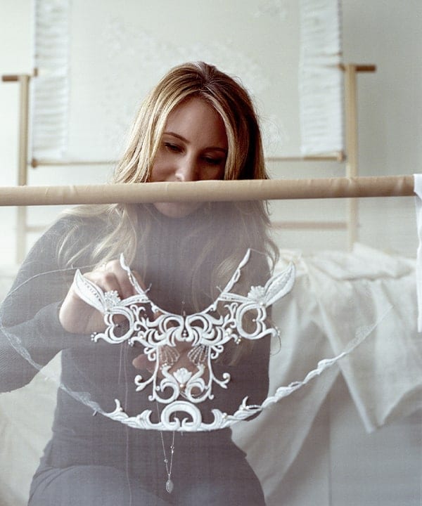 Consumed by a love of detail, couturier Suzie Turner uses detail and outstanding British craftsmanship to create some of the most beautiful dresses imaginable. With 25 years experience, each dress she creates is a celebration of traditional skills and pain staking laborious hand embroidery, from sweepingly fabulous evening gowns to the exquisite wedding dresses for which she has become known. A label alone takes five days to hand stitch. ‘Each stitch is done here; each bead is applied and hand-knotted here.’