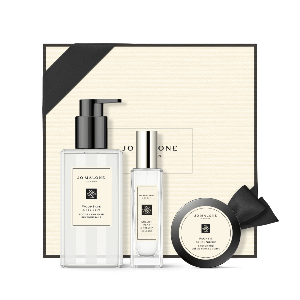A trio of Jo Malone London Favourites. Elevate your daily routine with fresh Wood Sage & Sea Salt Body & Hand Wash, hydrate & nourish skin with flirtatious Peony & Blush Suede Body Crème and scent skin with fruity English Pear & Freesia Cologne.